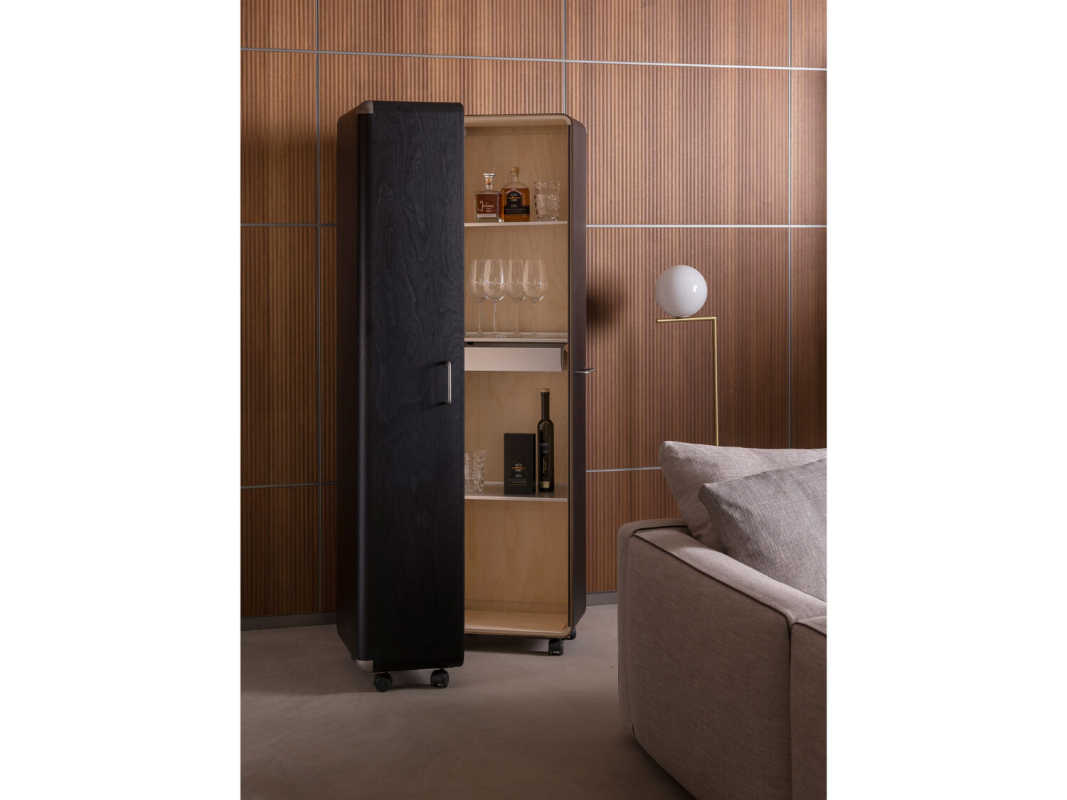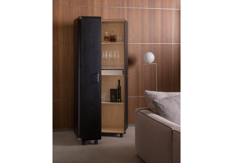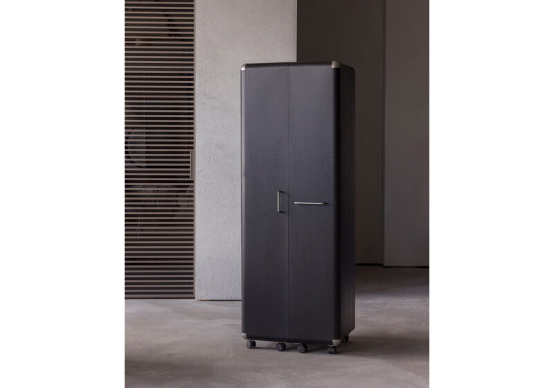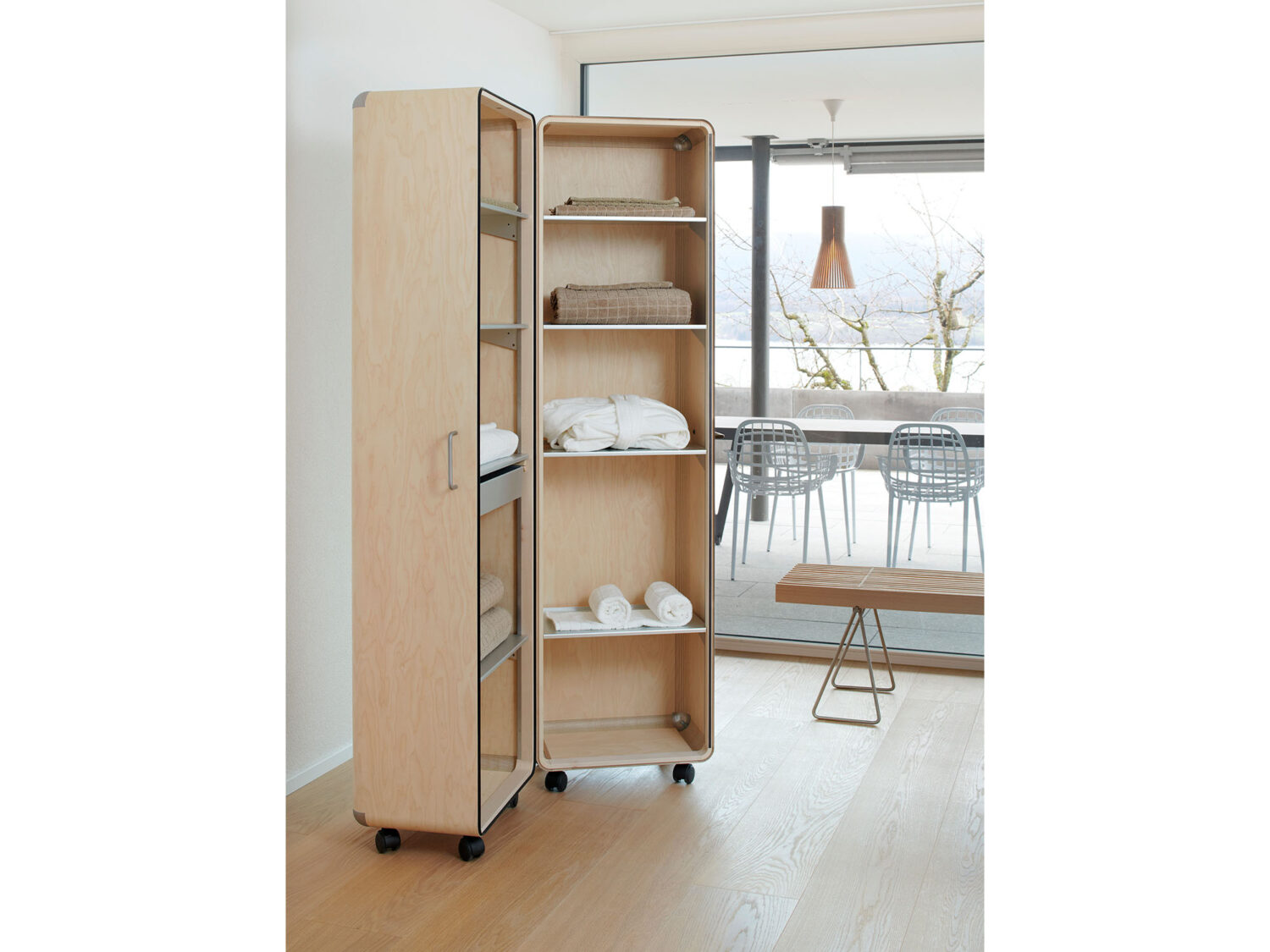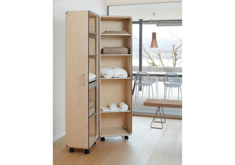 Shell is simple by nature and immediately revealing. Masterly craftsmanship makes its uncompromising restraint a pleasure to the eye. Selected large sheets of Finnish aviation plywood are grooved and molded into storage elements. Two caster-mounted elements enclose a dustproof interior.