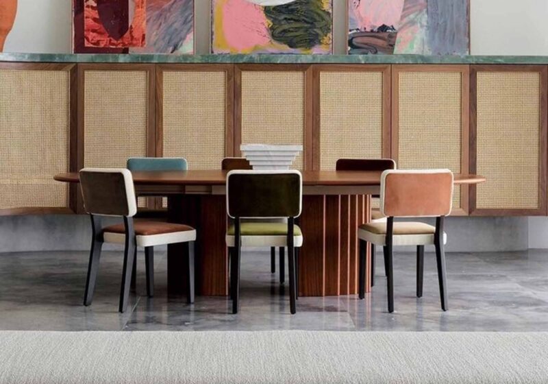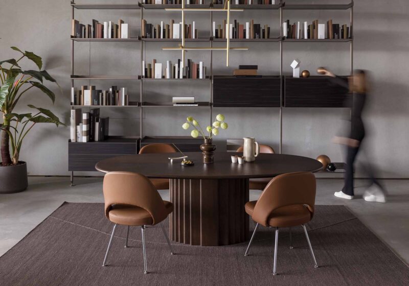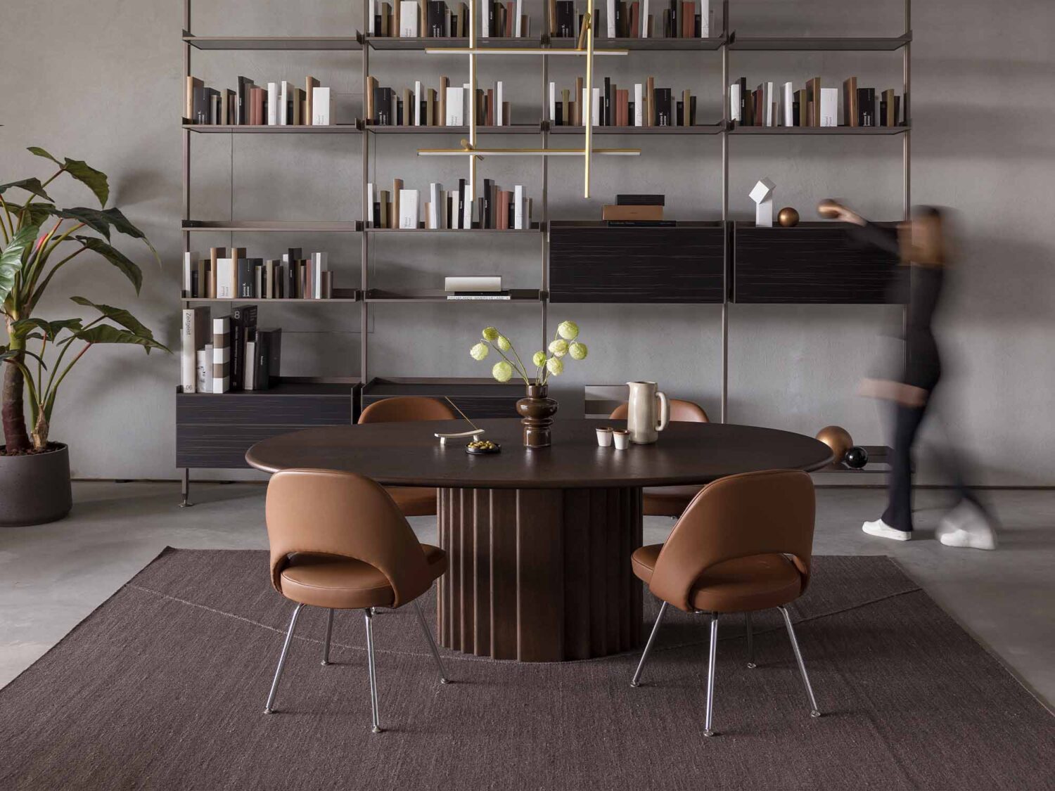 Ovaltisch präsentiert Zeitlosigkeit und Eleganz. Seine Qualitäten kommen vor allem in grosszügigen Ess- und Konferenzräumen zur Geltung. Der reich gegliederte Säulenfuss trägt eine ovale Tischplatte aus Mahagoni oder Eiche, wahrweise massiv oder mit sternenförmigem Furnier. Einlageplatten ermöglichen eine 3-malige Verlängerung des Tisches, ohne an Eleganz zu verlieren.
