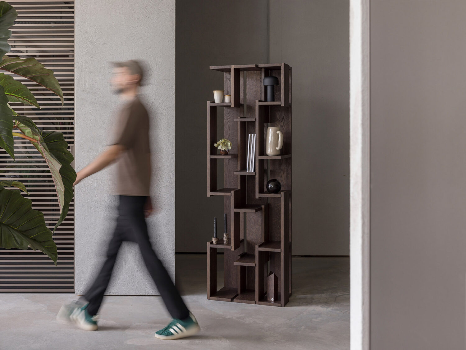 Staccato – ist ein skulpturales Regal von geradezu architektonischem Format. Archaisch und raffiniert zugleich ist die Bearbeitung des Holzes. Die Aussenseiten sind in einem gebürsteten Finish lackiert. Staccato lebt stark von den Rhythmen der verschieden grossen Etagen und Abtrennungen. Das einzigartige Regal eignet sich auch für grossformatige Bildbände und ist in diversen Kombinationen erhältlich. Staccato ist zudem der ideale Raumteiler, nach dem immer wieder gesucht wird. Die 2er und 3er Elemente erlauben eine konsequente Aufreihung/Erweiterung, die sich individuell an Raum und Bedürfnisse anpassen lässt.